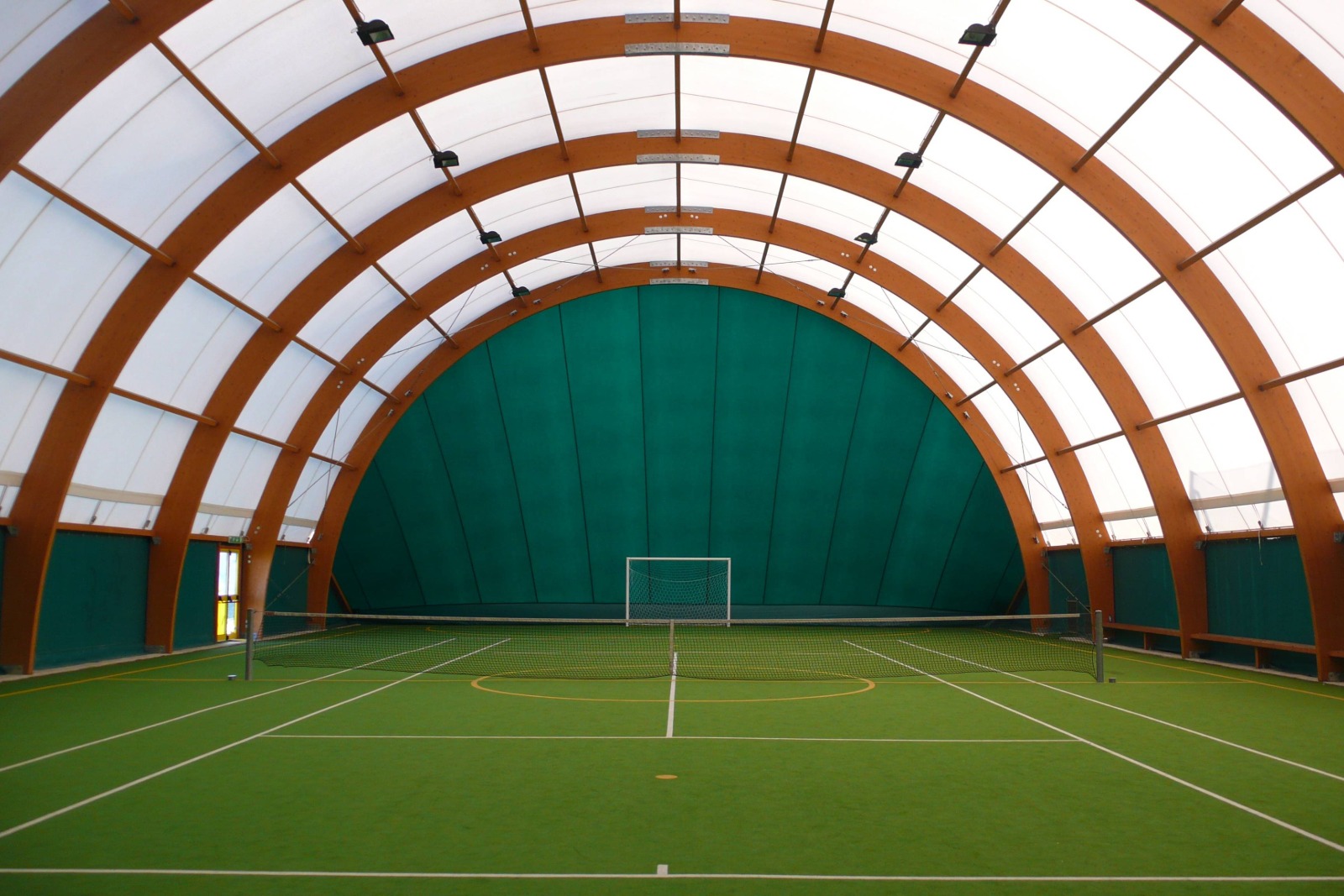 Quando il progetto richiede una copertura permanente con elevate prestazioni strutturali e un’estetica di pregio, il legno lamellare è il materiale per eccellenza. Resistente, leggero rispetto al cemento, naturalmente isolante e di grande impatto visivo, si presta perfettamente alla realizzazione di coperture per impianti sportivi di medie e grandi dimensioni: palazzetti, piscine coperte, tennis hall, bocciodromi e strutture polivalenti.